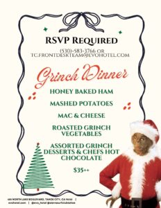 Join in on on the fun on Dec 16th! Starting with FREE cookie decorating at 4:30pm and a showing of “That Christmas” at 5pm. Followed by dinner ($35) at 7pm followed by a showing of “The Grinch” at 7:30pm. RSVP Required for dinner. 530-583-3766 or tc.frontdeskteam@evohotel.com